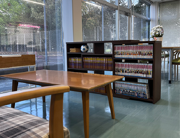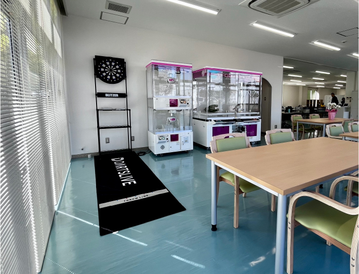 ゆったり作業をしたい人、頑張りたい人それぞれの思いを「仕事」という形に変えられるのがあじき福祉作業所です。無理のないペースで作業に取り組んでいただける仕組みがひびきの杜にはあります。作業の合間には本格クレーンゲームやダーツ、PS5にコミックとお好きな場所でお好きなものを選んで遊んでいただくことが可能です。12畳の広々和室でのリラックスタイムなどくつろぎの場所を提供します。
