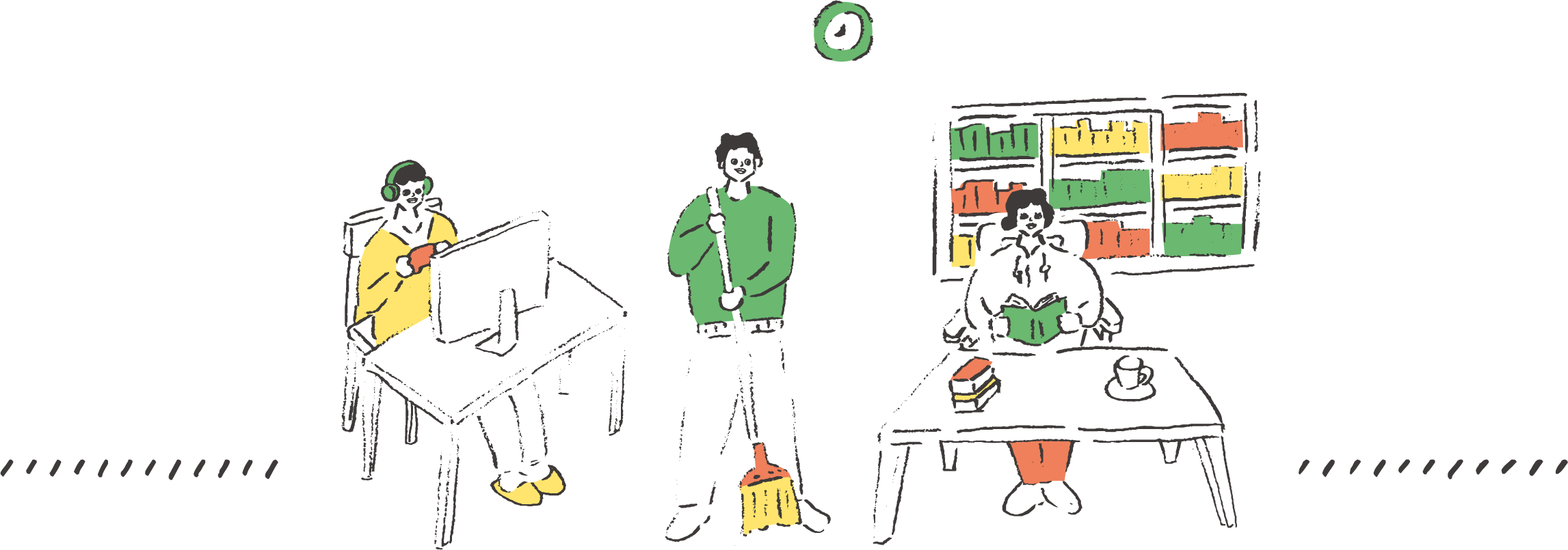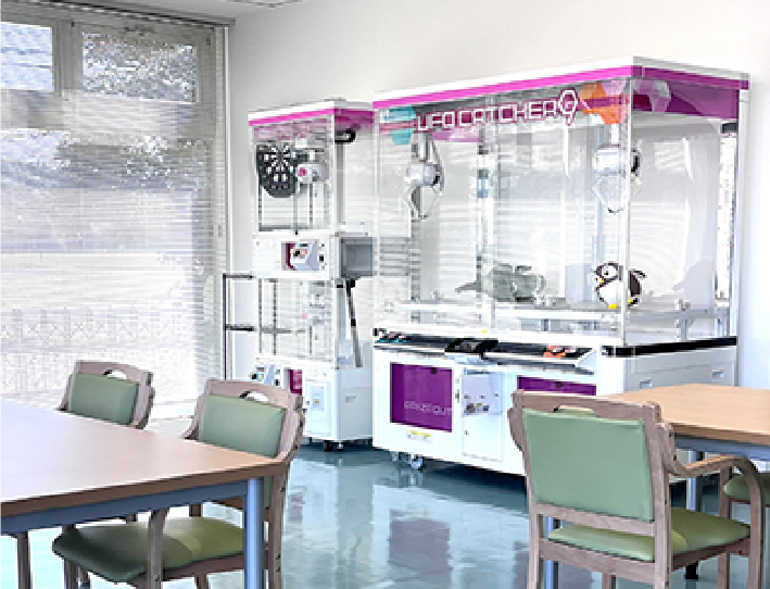 ゆったり作業をしたい人、頑張りたい人それぞれの思いを「仕事」という形に変えられるのがあじき福祉作業所です。無理のないペースで作業に取り組んでいただける仕組みがひびきの杜にはあります。作業の合間には本格クレーンゲームやダーツ、PS5にコミックとお好きな場所でお好きなものを選んで遊んでいただくことが可能です。12畳の広々和室でのリラックスタイムなどくつろぎの場所を提供します。